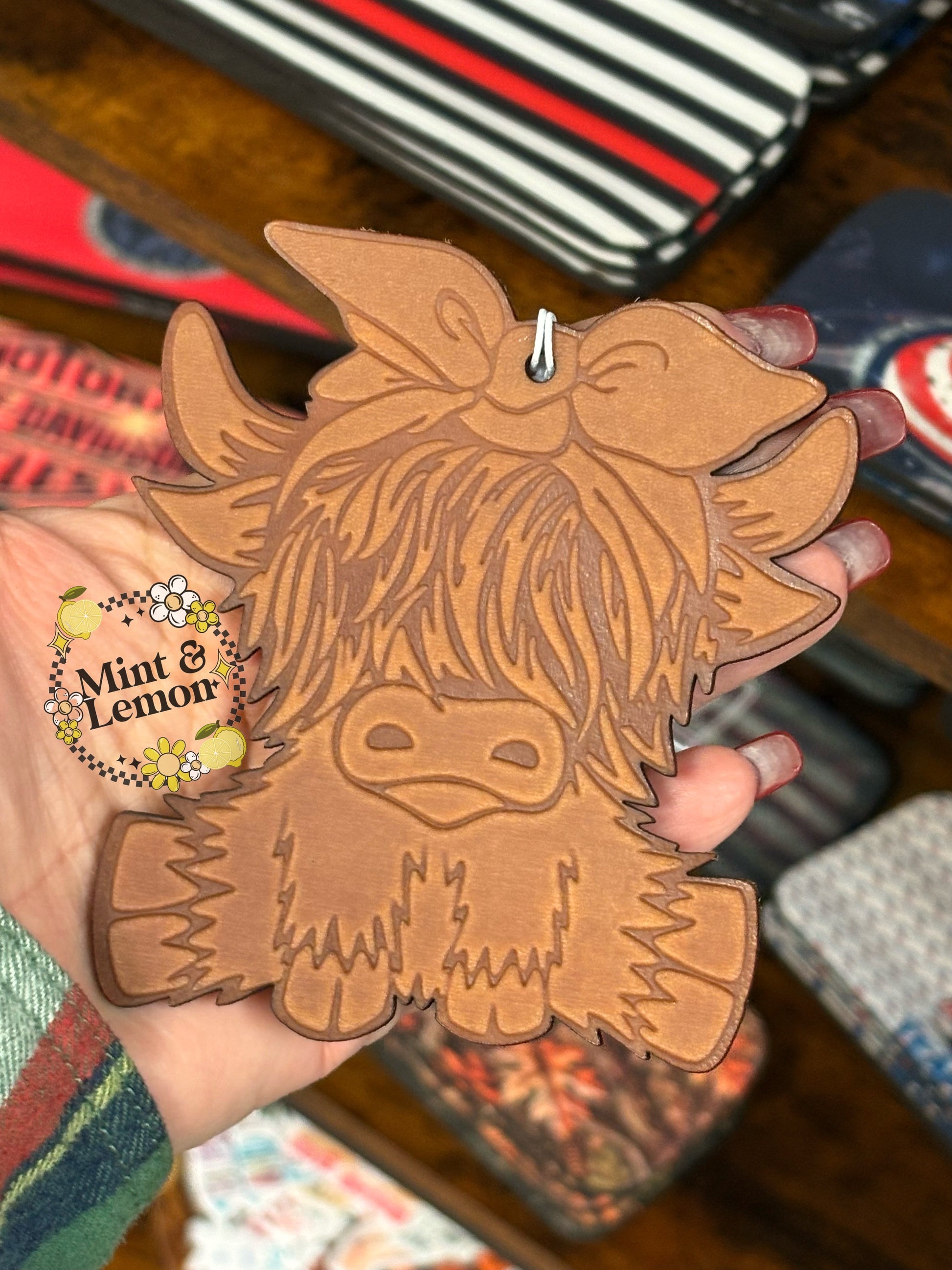Leather car freshies are a new way to add a fun scent to your car. Each freshie is pre scented with a nontoxic oil.  Scent will last anywhere from 3-6 weeks depending on elements.